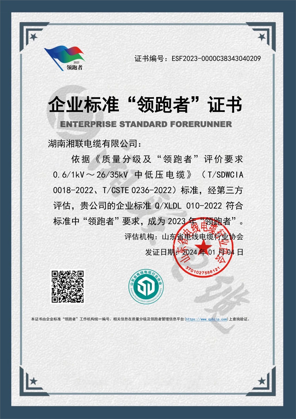 1月,企業(yè)標準領跑者管理信息平臺公布了2023年企業(yè)標準領跑者名單,湖南湘聯(lián)電纜有限公司憑借企業(yè)標準Q/XLDL 010-2022,成為2023年企業(yè)標準“領跑者”,湘聯(lián)電纜連續(xù)三年獲此殊榮。