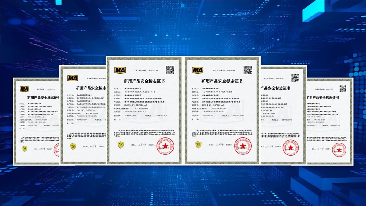 5月,湖南湘聯(lián)電纜有限公司成功取得安標國家礦用產品安全標志中心頒發(fā)MVV-0.6/1(1.5~300)mm2煤礦用聚氯乙烯絕緣聚氯乙烯護套電力電纜、MYJV-8.7/10(25~300)mm2煤礦用交聯(lián)聚乙烯絕緣聚氯乙烯護套電力電纜等六個產品的礦用產品安全標志證書。